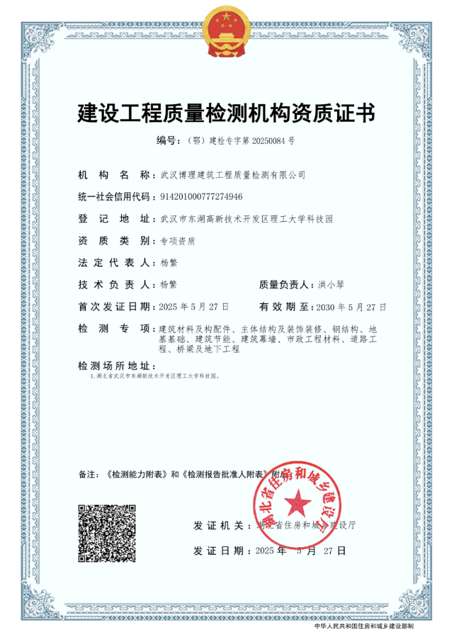 武汉博理建筑工程质量检测有限公司是武汉市建筑业协会建筑检测分会理事单位,2022 年获评“2020-2021 年度武汉建筑工程质量检测四星级单位”,2022年获评“高新技术企业”,2023年获评“光谷瞪羚”企业。